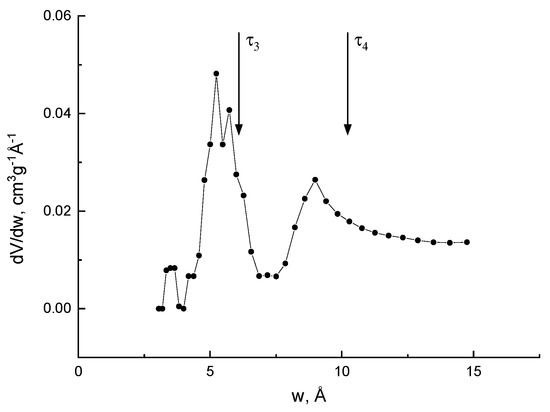 Pore size distribution obtained for a polymer with intrinsic microporosity by the sorption technique with processing, according to the density functional theory NLDFT (w: hole size). The vertical arrows indicate the positions of the maxima in the pore size distribution dV/dw, according to the positron annihilation data (courtesy by prof. Victor Shantarovich).