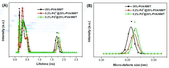 The microscopic structure of PVA intercalated montmorillonite was studied by Zhao et al. [100]. o-Ps atoms, distributed between the interlayer spacing of MMT as well as in the free volumes of PVA, show a decreasing lifetime as more PVA chains (up to 20%) are intercalated into MMT layers. This is reasonable, since lifetime in PVA is about 60% of that in MMT. At higher PVA loading, an increase in lifetime is observed, interpreted in terms of the presence of micro defects in the exfoliated MMT, since the interlayer space of the exfoliated structure is higher than that in the intercalated structure. The authors find also a small increase in the open spaces in the PVA/MMT structure when including Pd (Figure 7), attributed to the replacement of the intermolecular hydrogen bonding from PVA chains by the interactions between PVA chains and Pd. Figure 7B shows the great sensitivity of the PALS technique in highlighting variations in the sizes of micro-defects well below the tenth of nm.