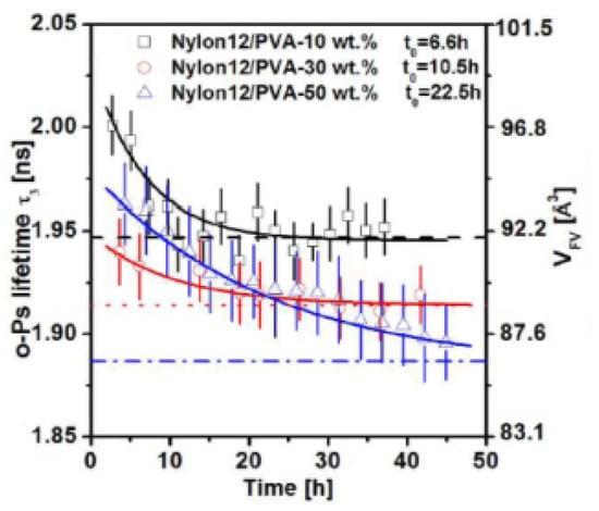 The free volume of blends Nylon12/PVA, treated with supercritical CO2, was studied using PALS [108]. Lifetime and intensity of o-Ps decrease with increasing content of PVA with respect to neat Nylon12, which is attributed to the higher crystallinity of PVA as well as the extra intermolecular hydrogen bonding between Nylon12 and PVA, acting as physical crosslinks that reduce the molecular mobility of Nylon12 and the free volume sizes. Treatment with supercritical CO2 expands the free volume holes and, after depressurization, o-Ps lifetime reduces exponentially with time, showing relaxation times that are the longer, the higher the concentration of PVA in the blends (Figure 9). This agrees with the previous remark of reduced mobility of Nylon12.