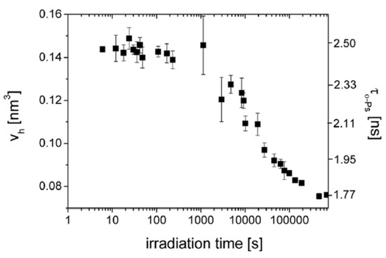 The photopolymerization process has also been studied using PALS. Svajdlenkova et al. [112] investigated the evolution of the free volume during photopolymerization in a commercial photopolymer (SPOT LV). Since network formation proceeds at a fast rate, while PALS measurements are ordinarily of the order of at least one hour (depending on the activity of the source), it was necessary to discontinuously irradiate the sample to allow to carry out the PALS spectra during the non-irradiation period. Furthermore, a light source of weak intensity was used to slow down the photopolymerization process. The mean value of the o-Ps lifetime distribution, and therefore the average hole volume, decrease after 1000 s irradiation, pointing out a shrinkage during crosslinking, due to the shortening of the chemical bonds (Figure 10). Intensity of o-Ps versus irradiation shows three regions characterized by different kinetics. After a slow increase, at about 5000 s a change in the slope is observed, corresponding to the acceleration of the curing process. A lower slope above 20,000 s indicates a slowdown of the crosslinking reaction, which is ending. The width of the lifetime distribution also gives interesting information. Indeed, a gradual narrowing after about 5000 s is indicative of the homogenization of the material as the crosslinking proceeds.