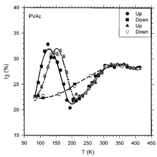 Use of Equation (4) to quantify the free volume fraction is common in many studies but should be cautiously considered. In fact, Ps formation and, consequently, I3 is influenced by various factors [114,115,116], and it is not easy to disentangle the contribution of the number density of holes. In particular, o-Ps intensity in PVAc samples [115] subjected to wide range of temperatures shows hysteresis (Figure 11).