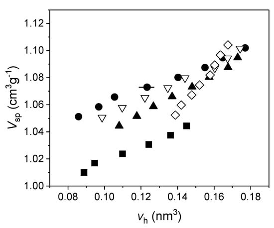 - Consolati, G.; Mercurio, G.; Quasso, F. Free volume fraction and nanoholes shapes in polyvinyl acetate. Chem. Phys. Lett. 2009, 475, 54–57. [Google Scholar] [CrossRef]