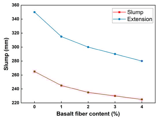 As an important component in the preparation of BFRPC, the inclusion of basalt fiber has brought new changes to the workability of the RPC matrix. Jia et al. [24] compared the differences in the influence on RPC matrix flowability between basalt fiber, steel fiber, and polypropylene fiber. The results demonstrated that although the inclusion of fiber reduces the flowability of the RPC matrix, due to the smaller diameter of basalt fiber relative to the other two fibers, the number of fibers per unit area under the same fiber content is far greater than the other two fibers, and its impact on the flowability of the RPC matrix is more significant. Liu et al. [25] conducted tests on the slump and spread of BFRPC, with fiber contents ranging from 0% to 4%. As the content of basalt fiber increased, the flowability of RPC gradually decreased, and the rate of decrease gradually slowed down (Figure 2).
