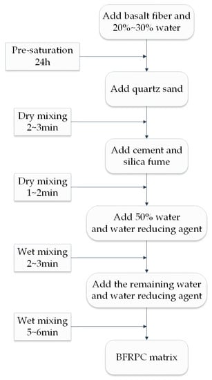 After determining the base material ratio of the BFRPC mixture to a certain extent, the specific preparation process needs to be discussed. Ensuring the uniform distribution of all components in the matrix is also an important aspect of concrete’s performance. Compared with steel fiber, basalt fiber is more flexible, and it is usually coated with plastic before packaging to prevent surface oxidation. Therefore, the preparation process of BFRPC is different from that of traditional UHPC, which is mainly composed of SF. [28] proposed two preparation methods according to the different incorporation methods of basalt fiber: