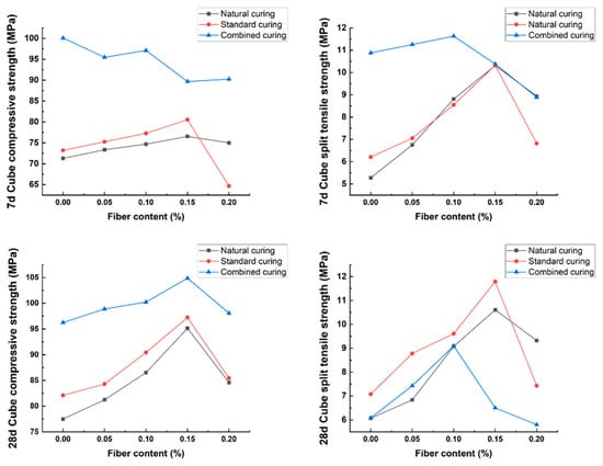 Curing conditions affect the cement hardening rate and microporous structure of BFRPC, thereby affecting its mechanical properties. Shan [29] studied the effect of different curing regimes on the compressive strength of BFRPC and found that under high humidity and temperature curing conditions, the compressive strength of BFRPC at 28 d is higher. Moreover, the improvement effect of different curing conditions is as follows: Hot water curing combined with dry heat curing > hot water curing combined with standard curing > hot water curing > standard curing, with a maximum improvement of 121.38% between them. Zhou [21] analyzed the effect of different water bath curing temperatures (50 °C, 70 °C, and 90 °C) on the flexural and compressive strength of BFRPC and concluded that compared with standard curing, the flexural strength of BFRPC under high-temperature water bath curing was significantly improved in the early and late stages, with a maximum improvement of 41.78% at 28 d. The compressive strength of the BFRPC under high-temperature water bath curing developed rapidly in the early stage, and the strength at 3 d was the highest, with an increase of nearly 75% compared with the standard curing condition, approaching the strength at 28 d. However, with increasing curing age, the growth rate of the compressive strength gradually decreased. According to the test results of the compressive and splitting strengths of BFRPC under different curing conditions of natural curing, standard curing, and combination curing by Zhang et al. [30], the early compressive and splitting strengths of BFRPC under combination curing were the best. However, it should be noted that with increasing curing age, the splitting strength of BFRPC under combination curing did not increase significantly and even appeared to be “shrinking”. For the maximum improvement in compressive and splitting strength, the recommended fiber content of BFRPC was 0.15% for natural curing and standard curing and 0.10% for combination curing (Figure 4).