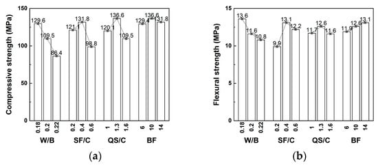 The influence of RPC matrix on (a) compressive strength and (b) flexural strength of BFRPC [31]. W/B, water/binder; SF/C, silica fume/cement; QS/C, quartz sand/cement; BF, basalt fiber.