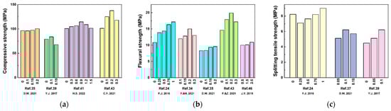 In addition, many studies [42,43,44,45,46] have investigated the effects of basalt fiber reinforcement on the mechanical properties of BFRPC from various aspects, such as fiber content and length. Figure 6 shows the study results of the effect of basalt fiber content on the mechanical properties of BFRPC.