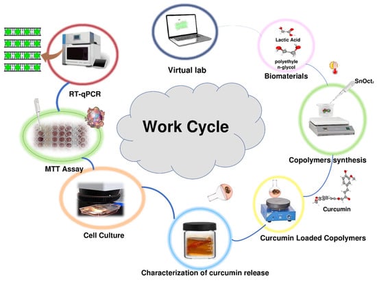 The work cycle utilized in this study included computational analysis of expected conformational behavior of copolymers, synthesis of copolymers, loading copolymers with curcumin, characterization of curcumin release in vitro, analysis of the effects of the curcumin-loaded polymers on viability of the MCF-7 cancer cells, and analysis of the effect of the treatment the MCF-7 cancer cells with the curcumin-loaded polymers on the expression several target genes. This work cycle is schematically represented in Figure 1.