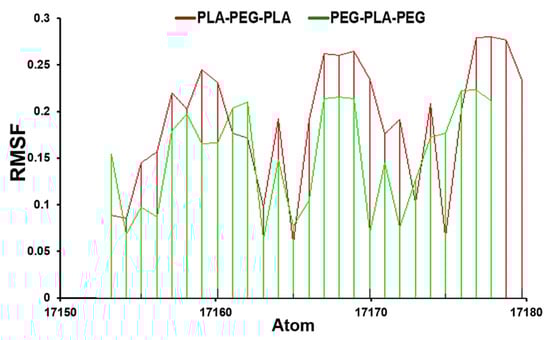 The comparative investigation of RMSF values displays that PLA-PEG-PLA fluctuated between 0.14–0.18 nm, while the PEG-PLA-PEG value was between 0.05–0.15 nm (Figure 3).