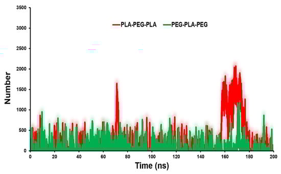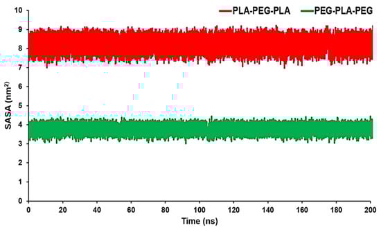 SASA can measure the proportion of the copolymers’ surface that can be accessed by the water molecules. In other words, in this case, SASA can be used to measure the proportion of the copolymer surface that can be accessed by water molecules. These data can confirm RDF results conducted by the MD trajectory. The average SASA amount for PLA-PEG-PLA was 8.0923 nm2, while the average SASA amount for PEG-PLA-PEG was 3.7654 nm2. From Figure 5, we can see that PLA-PEG-PLA had higher SASA values over a span of 200 ns.