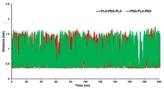 The binding free energy from Equation (2) is −3003.701 and −2797.846 for PLA-PEG-PLA and PEG-PLA-PEG, respectively. Moreover, the average amount of potential energy for the system containing PLA-PEG-PLA and PEG-PLA-PEG is −287,450 and −256,855 , respectively, which indicates that the system containing PLA-PEG-PLA has greater stability.