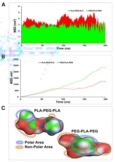 MSD evaluation for PLA-PEG-PLA and PEG-PLA-PEG. (A) Transverse diffusion, (B) lateral diffusion, and (C) polar and non-polar areas of block copolymers via Gauss View.