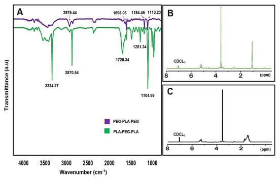 (A) The FT-IR spectra of copolymers, (B) 1H-NMR spectra of PLA-PEG-PLA, and (C) 1H-NMR spectra of PEG-PLA-PEG.