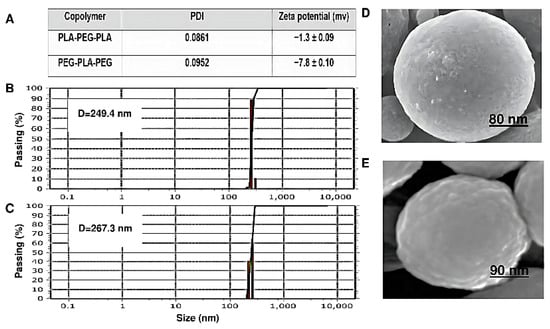 As shown in (Figure 10D,E), the morphology of both the block copolymers has a regular spherical structure and a homogeneous surface without signs of collapse. However, the surface of PEG-PLA-PEG is slightly more swollen than that of PLA-PEG-PLA, which can appear during the drying step, and at the same magnification, it has a smaller diameter.