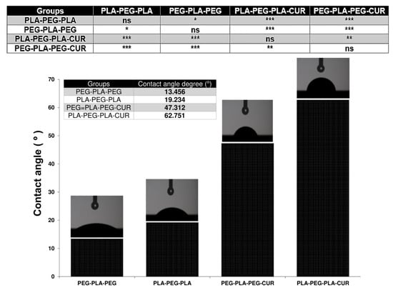 Another important feature of the copolymer surface is the degree of hydrophilicity that is displayed by contact angle measurement. The results of this analysis are shown in Figure 11 and were 19.234 and 13.456° for PLA-PEG-PLA and PEG-PLA-PEG, respectively. Since their chain terminals are different, they have distinct degrees of hydrophilicity. When curcumin was added to the systems, the extent of hydrophilicity decreased and was reported as 62.751 for curcumin-PLA-PEG-PLA and 47.312 for curcumin-PEG-PLA-PEG.