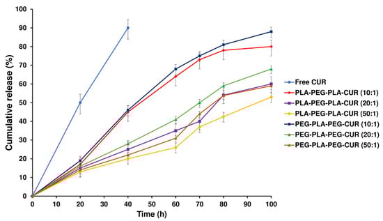 The release profiles of curcumin from curcumin-loaded copolymers were evaluated to assess their potential as carriers for the drug. The curcumin release profiles for curcumin-loaded PLA-PEG-PLA and PEG-PLA-PEG with different w/w ratios are displayed in Figure 12. A sustained release of curcumin was observed for 100 h by diffusing through the PLA-PEG-PLA copolymer compared with the free curcumin, which released 92% within 40 h. Initially, about 20% of the loaded drug rapidly was released in 18 h for two systems (curcumin-loaded PLA-PEG-PLA and curcumin-loaded PEG-PLA-PEG); then, the drug was released slowly for the remaining time. Approximately 80% of the total curcumin loaded in PLA-PEG-PLA at 1:10 w/w ratio was gradually released over 100 h. The PLA-PEG-PLA released 60.3% and 53.8% of the total curcumin, respectively, at w/w ratios of 1:20 and 1:50. The release profile of PEG-PLA-PEG shows the same mechanism as the PLA-PEG-PLA. After 18 h, about 20% of the loaded drug was released, and then, curcumin was released slowly up to 100 h. Approximately 88% of the curcumin loaded in PEG-PLA-PEG at a 1:10 w/w ratio was released over 100 h, which had a faster release than PLA-PEG-PLA. Also, at w/w ratios of 1:20 and 1:50, the total curcumin released was 68.2% and 59%, respectively (Figure 12).