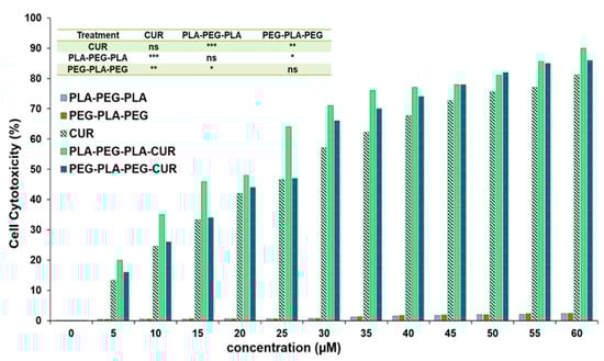 MCF-7 breast cancer cells were employed to evaluate the cytotoxicity of block copolymers and those containing curcumin using MTT essay. MCF-7 cells were seeded in 96-well plates (5 × 103 cells per well) with 150 µL/well RPMI medium containing 10% FBS and 1% penicillin/streptomycin. Cells were incubated for one day at 37 °C in a humidified incubator with 5% CO2 and 95% humidity. In all cellular assays, the cells were treated with different concentrations (0–60 µM) of free curcumin, PLA-PEG-PLA, PEG-PLA-PEG, curcumin-PLA-PEG-PLA, and PEG-PLA-PEG-curcumin, for 48 h. PBS-treated cells were taken as control (cnt). Percent cell death was calculated by following Equation (7), and the IC50 values for curcumin, curcumin-PLA-PEG-PLA, and curcumin-PEG-PLA-PEG were determined [42].