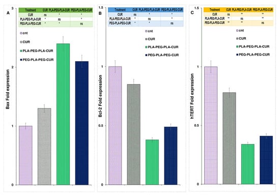 Favorable attributes of PLA-PEG-PLA, including higher drug loading and slow release of loaded curcumin, are likely the key contributors to increased cell death in MCF-7 cells. Further, this copolymer affected the gene expression levels to the greatest extent compared to curcumin and curcumin-PEG-PLA-PEG. The decrease in Bcl-2 and hTERT expression and increase in Bax expression correlates with apoptosis-mediated death of MCF-7 cells [49,50,51]. Overall, our results indicated that PLA-PEG-PLA is an efficient delivery vehicle for hydrophobic drugs such as curcumin.