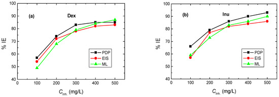 - The % IEs of Dex and Inu at a dose of 500 mg/L reached 85% and 93%, respectively.