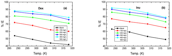 - The inhibition efficiencies (% IEs) of the tested biopolymers were improved by augmenting their doses while reducing with rising temperature.