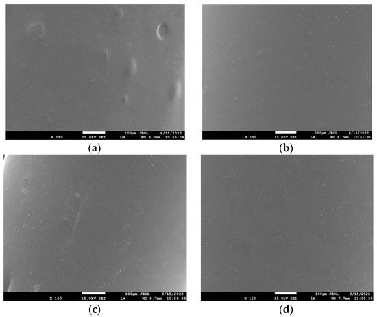 The dispersion of rPLA in the rPLA/rPET blend as well as that of the nanoclays, Cloisite 25A, and Na+MMT in the composites’ matrix was evaluated using SEM, as shown in Figure 1, Figure 2 and Figure 3 for the blends with 50/50, 70/30, and 90/10 rPLA/rPET, respectively. In the 50-50 blends, it seems that the dispersion of rPLA into rPET is homogeneous. However, in higher amounts of rPET, i.e., in the 90/10 blend (Figure 3), large parts of rPLA seem to be included into the rPET matrix and the blend is not completely homogeneous. Furthermore, with small amounts of nanoclay added (i.e., 1 and 5 wt%), the SEM images show homogeneous samples without any large aggregates of the nanoclay, confirming good dispersion of the nanoclay in the composites. However, some aggregates can be observed in the higher amounts (i.e., 10 wt%) used. In general, the presence of nanoclay aggregates in the polymer matrix is not desirable since it leads to the formation of inhomogeneities in the material. This can lead to inferior mechanical or thermophysical properties (discussed in the next section), which gives an initial indication that such large proportions of clay should be avoided.
