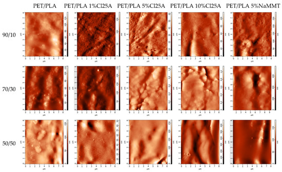 Furthermore, the topography and roughness of the samples was investigated using atomic force microscopy (AFM). Indicative images of all the nanocomposite blends investigated appear in Figure 4.