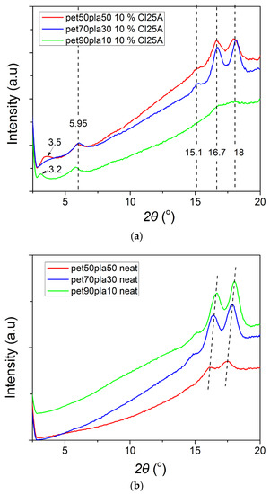 XRD scans of the PET/PLA blends at various ratios (a) with 10% Cloisite 25A and (b) without the nanoclay.