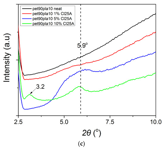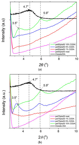 Furthermore, it is interesting to study the status of the nanoclay in the polymer matrix. It is known that the platelets of the nanoclay can be either intercalated or exfoliated in the presence of the macromolecular chains. This can be easily identified from XRD measurements at low angles. Therefore, the results are illustrated in Figure 6, focusing only on the range from 2 to 10°. The neat Cloisite 25A diffraction peak was observed at 4.7°, which is equivalent to 1.89 nm, a value similar to that reported by the company that supplied the nanoclay, i.e., 1.86 nm. In most nanocomposite blends, two reflection peaks appear at 3.5° and 5.9°. The first corresponds to a d001 spacing of 2.53 nm and the second corresponds to 1.5 nm. The increase in the spacing between the platelets from 1.89 to 2.53 nm is an indication of an intercalated structure. Exfoliated clay would result in the absence of diffraction peaks. However, a decrease in the d-spacing to 1.5 nm is an indication of the presence of clay tactoids (the existence of small-scale agglomerates). The intensity of the peaks of the nanocomposites with 1% clay is lower if any of them reflect on one side with the low amount of filler, but this also indicates that the clay exits in partially intercalated and partially exfoliated structures. In contrast, in the nanocomposite with 10% Cl25A, the peaks are clearly indicating both intercalated structures with clay tactoids. In the 70/30 blend after the addition of 1 or 5% Cloisite 25A, the intercalation seems better since the diffraction peak was observed to be lower at 2θ = 3.3°, corresponding to d-spacing of 2.69 nm.