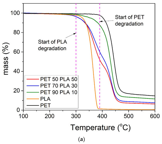 TG scans for the neat rPLA, rPET, and their blends together with the derivative of the corresponding TG scans appear in Figure 7a,b. It can be seen that PLA degrades at a much lower temperature compared to PET. Specifically, rPLA starts degrading at around 300 °C, whereas the onset of rPET degradation is at almost 380 °C, in accordance with the literature values [23]. Degradation of the PET/PLA 50/50 and 70/30 blends starts at slightly lower temperatures compared to the neat rPLA, at around 276–277 °C, with the blend richer in PET showing an onset temperature in between those of rPLA and rPET (i.e., 316 °C). It has been proposed that the degradation of PLA is promoted by ester interchange reactions, whereas random chain-scission via a cis-elimination is the dominant mechanism [36,37,38]. Therefore, the first step of the blends’ degradation may be attributed to ester interchange reactions due to the presence of PET. In addition, the thermal degradation curves of all neat polymers exhibit one step, whereas those of all blends clearly show two steps in the temperature region between that of rPLA and rPET. The first degradation step is attributed to the thermal degradation of rPLA, whereas the second is attributed to that of rPET. As was expected, higher amounts of rPET in the blend provide better thermal stability to the material. Therefore, it was verified that contamination of rPET with rPLA results in a product with poor thermal stability relative to rPET. Very interesting points also come from observation of the dTGA curves and the two dominant peaks appearing. It was clear (Table 3) that the second peak, attributed to the degradation of rPET, was almost constant in all materials tested and near to 435 ± 1 °C. The temperature at the maximum rate of degradation of rPET is also 435 °C. This means that the second peak in the derivative curves is clearly due to rPET degradation. However, concerning the first peak, the temperature shows a gradual increase from 368 to 380 °C with the increasing percentage of rPET in the blend. The maximum rate degradation temperature of the neat rPLA was measured at 367 °C. Therefore, it seems that at relative amounts of rPLA greater than those of rPET in the blend, rPLA keeps its identity and behaves like a neat rPLA. However, when rPET is in larger quantities, the presence of this polymer in the blend acts as a kind of barrier on the one hand to the heat transfer inside the material and on the other to the evaporation and removal of volatile compounds from the decomposition of rPLA. All of these factors result in shifting the degradation of rPLA to higher temperatures. A similar trend was observed in all other materials studied here.
