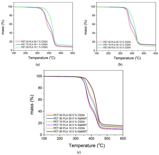 TG scans of the PET/PLA blends at a heating rate of 10 °C/min: (a) with 1 wt% Cloisite 25A; (b) 10 wt% Cloisite 25A; and (c) 5 wt% Cloisite 25A and 5 wt% Na+MMT clay.