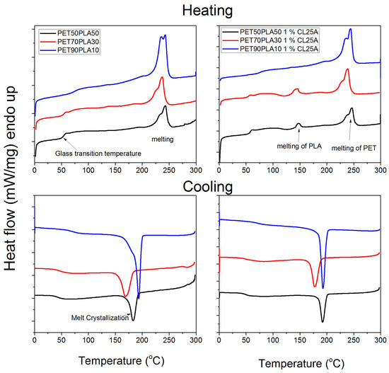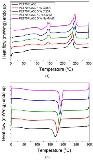 Finally, DSC measurements were carried out to estimate the thermal properties of the blends investigated. Indicative plots on the effect of the nanoclay on the heat flow recorded during heating or cooling appear in Figure 10a,b. Moreover, DSC scans showing the effect of the relative amount of the PET/PLA are illustrated in Figure 11. All results are included in Table 4.