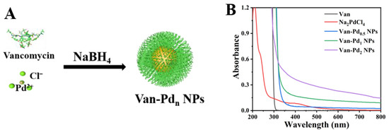 The synthesis of Van-Pdn NPs was first characterized by UV-vis spectrophotometry. Figure 1A shows the preparation method of Van-Pdn NPs. As shown in Figure 1B, Na2PdCl4 has an absorption peak at 420 nm in the UV-vis spectrum, which is caused by Pd2+. However, there is no characteristic absorption peak of Na2PdCl4 at 420 nm in the spectra of Van-Pd0.5 NPs, Van-Pd1 NPs, and Van-Pd2 NPs. When Pd2+ is reduced to Pd atoms, the absorption peak at 420 nm disappears [26]. Therefore, Pd2+ is reduced to Pd atoms in the process of synthesizing Van-Pdn NPs. This indicates the successful preparation of Van-Pdn NPs.