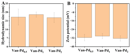 DLS is a commonly used way to characterize the hydrodynamic size and zeta potential of nanoparticles in water [27]. Since most of the reaction processes, such as the catalysis of nanozymes, are carried out in aqueous solutions, DLS testing of Van-Pdn NPs (n = 0.5, 1, 2) is required. As can be seen in Figure 3A, the hydrodynamic sizes of nanoparticles of Van-Pd0.5 NPs, Van-Pd1 NPs, and Van-Pd2 NPs were 24.1 nm, 26.1 nm, and 23.6 nm, respectively. The hydrodynamic size of Van-Pdn NPs (n = 0.5, 1, 2) with different molar ratios did not have an obvious difference. Moreover, the zeta potential of the Van-Pdn NPs was tested. As can be seen from Figure 3B, the zeta potentials of Van-Pd0.5 NPs, Van-Pd1 NPs, and Van-Pd2 NPs were −31.5 mV, −30.2 mV, and −32.4 mV, respectively. Among the Van-Pdn NPs (n = 0.5, 1, 2), Van-Pd2 NPs had the largest absolute value of zeta potential in aqueous solution.