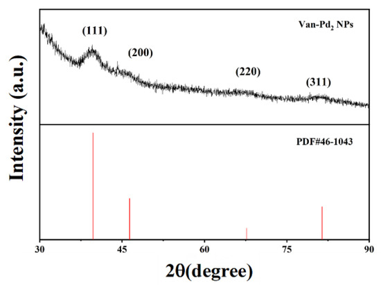 We selected Van-Pd2 NPs for subsequent XRD to analyze their composition and structure. The diffraction spectra of Figure 4 show that the 2θ values of Van-Pd2 NPs are 39.71°, 46.36°, 67.66°, and 81.42°, respectively. These diffraction angles corresponded to the (111), (200), (220), and (311) faces of Pd, respectively. Compared with the reference code 46-1043 of Pd, it can be seen that the diffraction angle is consistent with the diffraction angle in the reference code, so it can be proved that the nanozyme we synthesized contained the element Pd. Therefore, we have successfully synthesized Van-Pd2 NPs through the characterization of XRD.