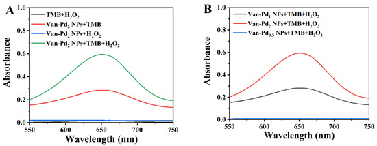 To test whether Van-Pd2 NPs have oxidase-like activity and peroxidase-like activity, we designed the following control groups: TMB + H2O2, Van-Pd2 NPs + H2O2, TMB + Van-Pd2 NPs, and TMB + Van-Pd2 NPs + H2O2. It can be seen from Figure 5A that after 5 min of reaction, the TMB + Van-Pd2 NPs group and the TMB+ Van-Pd2 NPs + H2O2 group had a characteristic absorption peak of oxTMB at 652 nm. The TMB+ Van-Pd2 NPs + H2O2 group showed an excellent characteristic absorption peak at 652 nm; the absorbance was 0.60. The TMB + Van-Pd2 NPs group showed a characteristic absorption peak at 652 nm, but the absorbance was only 0.28. The characteristic absorption peak intensity at 652 nm of the TMB + Van-Pd2 NPs + H2O2 group was 2.14 times that of the only Van-Pd2 NPs group. This indicated that Van-Pd2 NPs had good peroxidase-like activity. In addition, TMB was oxidized to form oxTMB in the TMB + Van-Pd2 NPs group, indicating the oxidase-like activity of Van-Pd2 NPs.