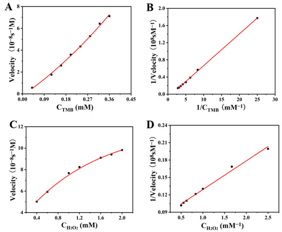 The catalytic kinetics of Van-Pd2 NPs for (A) TMB and (C) H2O2; (B,D) was the reciprocal of (A,C).