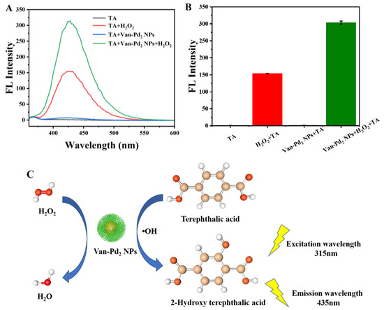 Furthermore, the peroxidase-like mechanism was tested using terephthalic acid (TA) as a fluorescent probe with the following steps. First, four experimental groups were established: TA, TA + Van-Pdn NPs, TA + H2O2 and TA + H2O2 + Van-Pdn NPs. As for TA + H2O2 + Van-Pdn NPs, 1000 µL of TA (CTA = 0.5 mM) was added into a 2 mL PE tube, and subsequently, 200 µL of an acetic acid-sodium acetate buffer solution with a pH of 4 was introduced into the same PE tube. The purpose of adding the buffer solution is to maintain a stable pH environment within the tube. This ensures that the conditions remain optimal for any subsequent steps or reactions that may take place. The fluorescence spectra of the final solution were measured using a fluorescence spectrometer to analyze the emission of light from the samples. The other control groups underwent the same experimental procedure as the samples being analyzed.