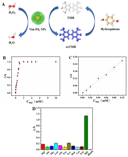 (A) Schematic diagram of Van-Pd2 NPs for colorimetric detection of HQ; HQ detection: (B) the plot of the absorbance difference (ΔA) of HQ; (C) linear fit plots of ΔA with different HQ concentrations; (D) selective detection of HQ.