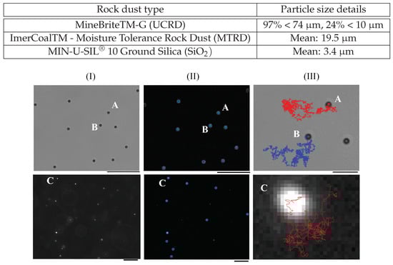 There exist many algorithms in literature to determine the centroid positions of the tracers; here, we use the well-established algorithm attributed to Crocker and Grier [41]. In order to identify and determine the center of each tracer particle, recorded images extracted from the videos were prepared to remove the background and other artifacts. The contrast was adjusted so that the particles are as bright as possible against the background and the image was converted to grayscale. Spatial bandpass filtering was used to remove spurious features and any bright spots present which did not fall within the particle size limits. The centroids of the remaining bright features were then determined. Spurious extreme particle sizes resulting from imaging two or more particles adjacent to one another were rejected in the tracer count. Even after employing the bandpass filter, some artifacts (non-tracers) remained as faint spots that were detected as real tracers by the algorithm. To remove these artifacts, images were filtered so that only particles above a brightness threshold were identified as real tracers. An example of this is illustrated in Figure 1, and specifically in Figure 1II top and bottom, we see real tracer particles identified (in one frame) and marked with a blue circle, and these are recorded in a database with a unique identifier.
