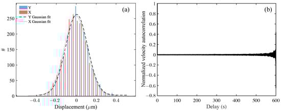 Analysis of tracer particle trajectories of the 2.29 m tracer particles in DI water, a Newtonian fluid. (a) Histogram of (particle-averaged, over single-particle trajectories) translational displacements in x and y Cartesian coordinates as tracked from Figure 1, displaying a Gaussian distribution with zero mean and finite variance (equal for both x and y components) for the probability distribution of tracer displacements. Since particles undergo free Brownian motion, the variance is related to the diffusivity and the delay time over which the displacements are evaluated [43]. (b) The normalized velocity autocorrelation function recorded as a function of delay time (in seconds) for trajectories. The velocity autocorrelation is nearly zero, confirming the Brownian motion of the tracers in DI water. Large fluctuations for large delay times are due to a decreasing number of sample trajectories.