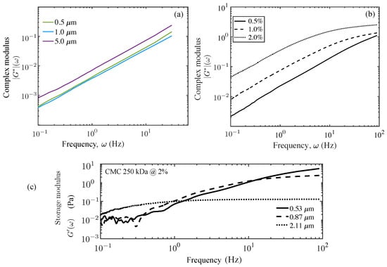 To contrast the viscously dominated response with weak elasticity of the 10 wt% mucin, and with a more elastic response for a viscoelastic fluid, we show extracted from the appropriate ensemble-averaged MSD data for CMC solutions in Figure 5b and in Figure 5c. Figure 5b investigates the effect of CMC concentration and illustrates the increasing elastic component as the concentration increases for all values of the frequency. Eventually at the high frequencies, we see a tapering of the curve (seen clearly for the 2% concentration) as the elastic component dominates over the viscous component. Increasing CMC concentration typically creates denser entangled networks, thus yielding higher values. We find that the complex modulus of 250 kDa CMC (G*) is lower than results for 700 kDa CMC [23]. Our CMC samples are with 250 kDa CMC, which consists of significantly smaller chains and crosslinks.