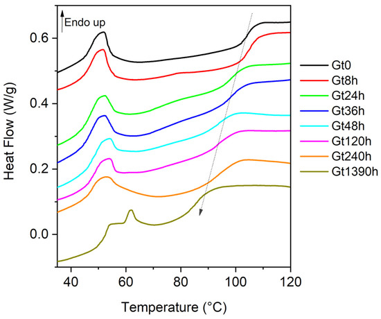 Experimental DSC curves of the heat flow normalized in the second heating scan vs. temperature for green samples at different ageing times (Gt0, Gt8h, Gt24h, Gt36h, Gt48h, Gt120h, Gt240h and Gt1390h). The Tg values are reported in Table 1. Upward peaks are endothermic phenomena (↑ Endo up). All curves are presented in the same scale and are stacked for purposes of clarity.