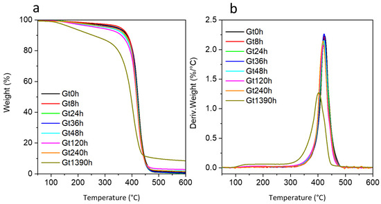 (a) Thermogravimetric (TG) curves and (b) their corresponding derivatives acquired under nitrogen flow at 10 °C/min heating rate for the green sample at different ageing times (Gt0, Gt8h, Gt24h, Gt36h, Gt48h, Gt120h, Gt240h and Gt1390h).