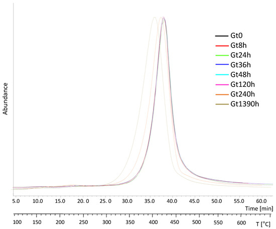 Total ion thermograms (TIT) of the samples from the green brick at different ageing times (Gt0, Gt8h, Gt24h, Gt36h, Gt48h, Gt120h, Gt240h and Gt1390h) normalized to 100.