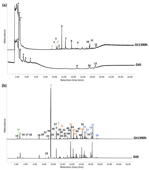 Main pyrolysis products detected in the first and second shot Py-GC-MS of Gt0 and Gt1390h (Figure 4a,b).