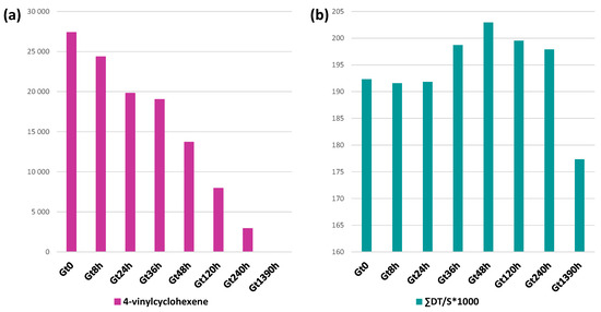 Histograms of the ratio of total ion chromatogram area in the Py-GC/MS chromatogram (shot 2) of (a) 4-vinylcyclohexene (normalized for sample weight) and (b) ratio between the sum of all styrene-containing dimers and trimers (ΣDT) over styrene (S) relative to the green brick at different ageing times (Gt0, Gt8h, Gt24h, Gt36h, Gt48h, Gt120h, Gt240h and Gt1390h).