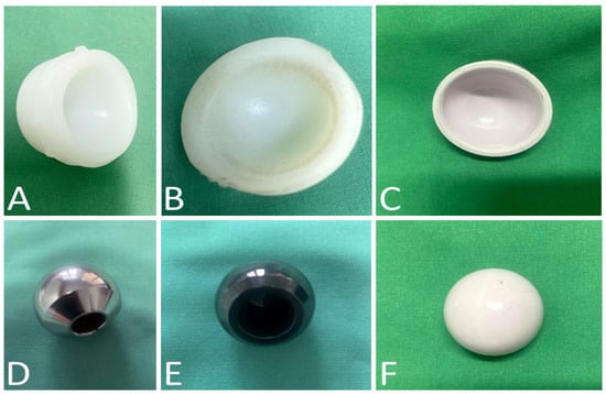 (A) HXLPE liner, (B) wear areas spotted on UHMWPE liner, (C) ceramic liner, (D) CoCrMo metallic head, (E) Oxinium head, (F) ceramic head (Orthopedics and Traumatology Department, Clinical Rehabilitation Hospital of Iași, Romania).