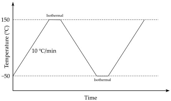Differential scanning calorimetry (DSC) investigations were carried out using a DSC 214 Polyma differential scanning calorimeter (NETZSCH, Selb, Germany) under a nitrogen (N2, CID 947) atmosphere with a flow rate of 30 mL/min. The PAN powder, the PAN nanofiber mat, and the annealed nanofiber mat were precisely cut and placed on the crucible for DSC. Figure 2 represents the heating cycle in the DSC; the first cycle was heated from −50 °C to 150 °C to remove impurities and moisture from the samples, then cooled to −50 °C, and heated again to 150 °C to observe the glass transition temperature. Between each heating and cooling cycle, a 1 min isothermal step was maintained.