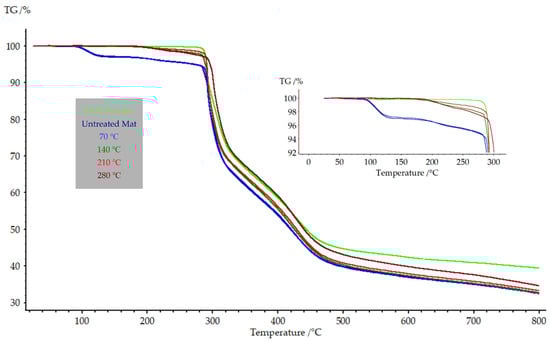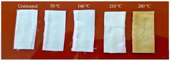 Figure 3 illustrates the visual appearance and result of annealing on nanofiber mats. The untreated nanofiber mats and those annealed at 70 °C and 140 °C were both white in color. Nanofiber mats annealed at 210 °C showed a pale yellow color; those annealed at 280 °C appeared golden, which is due to the beginning of the degradation and those annealed at 350 °C appeared to be thoroughly degraded and black. Nanofiber mats annealed at 350 °C were so frail that it was impossible to perform thermal or tensile tests. During annealing, the PAN nanofiber mats changed to light yellow and brown, a phenomenon also observed in our earlier study [].