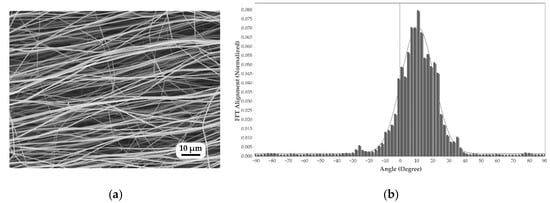 Figure 4a shows an SEM image of the untreated nanofiber mat upon which FFT analysis (fast Fourier transform) was performed. Figure 4b shows the results of an investigation into the alignment of the annealed PAN nanofibers. Although the drum revolved at 1800 rpm, the FFT alignment value (normalized) fluctuated from 0.0 to 0.085; most nanofibers were in a single direction. The constant rotational speed stabilized the drawing process and allowed for a consistent diameter range. Anisotropy is a significant factor in determining the mechanical properties of nanofiber mats. When nanofibers are randomly aligned, the mat has less strength than when they are aligned in a single direction. Furthermore, when the rotation speed of the drum collector exceeds 1000 rpm, the resultant nanofibers have a better aligned orientation (compared to rotational speeds less than 1000 rpm) [,].